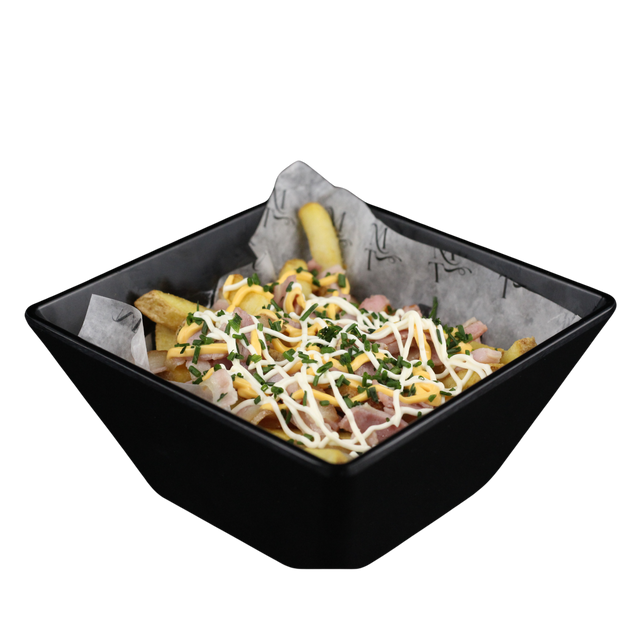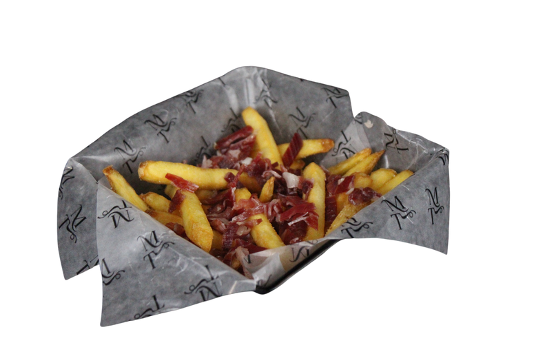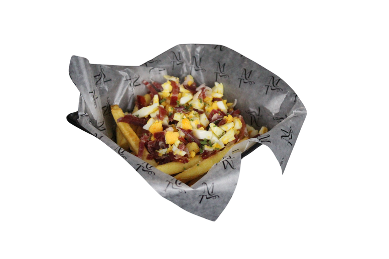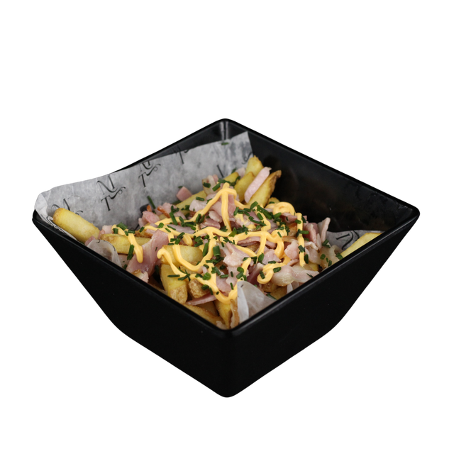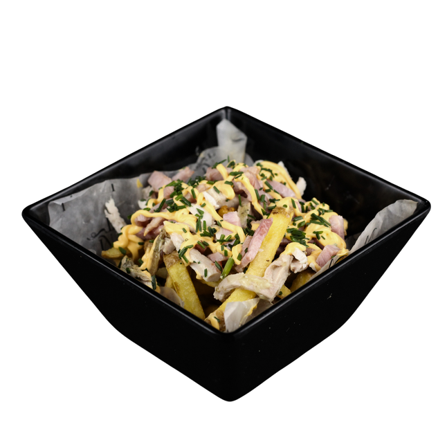 PATATAS FRITAS, POLLO ASADO, JAMÓN ASADO, BAICON, SALSA CHEEDAR Y CEBOLLINO