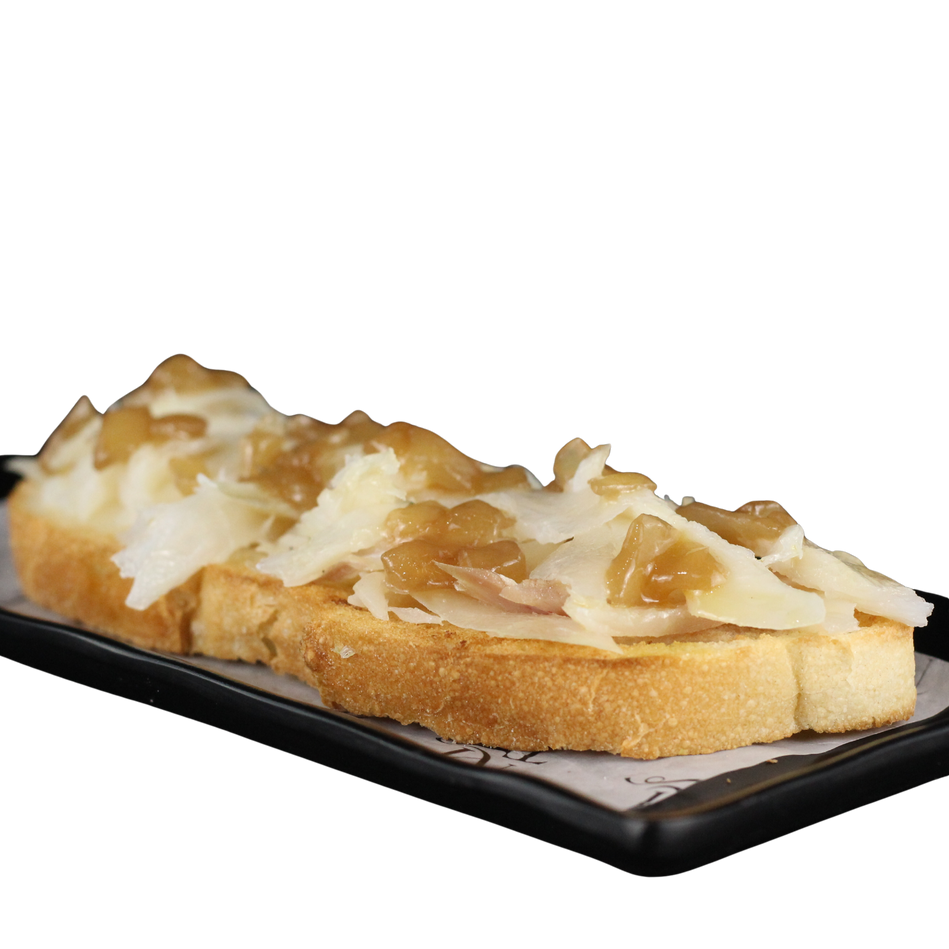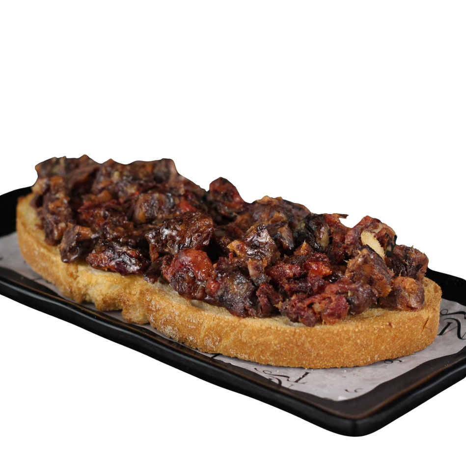 Picado de vaca, Queso Cabra, Cebolla caramelizada y Mermelada de tomate